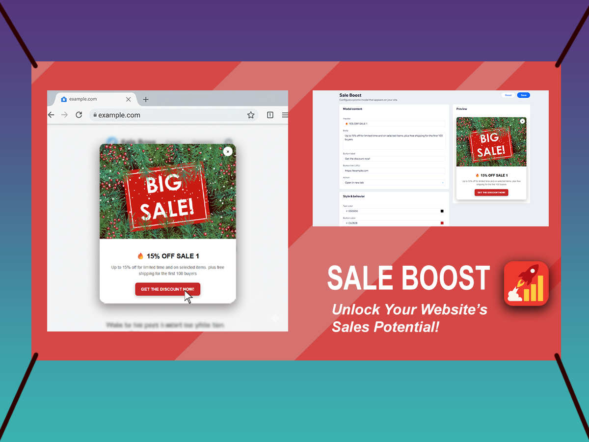 Sale Boost lets you easily configure and display promotional popups on your website to attract visitors and increase conversions. With a user-friendly settings panel, you can fully control the popup content, design, and behavior without any technical knowledge. Customize text, buttons, colors, images, and timing, then preview your popup instantly before publishing.