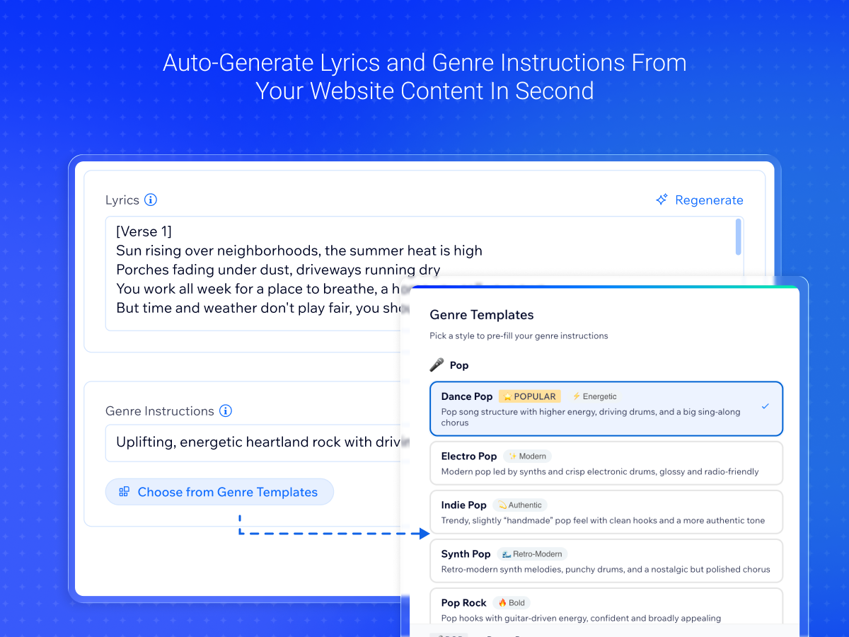 AI analyzes your website and instantly creates lyrics and music style instructions that match your brand voice