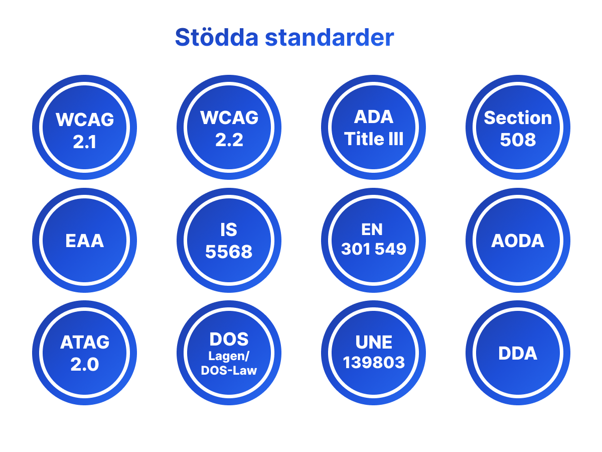 AxOrigin Accessibility-widgeten förbättrar webbplatsens efterlevnad av ADA-föreskrifter och förbättrar webbupplevelsen i enlighet med olika tillgänglighetsstandarder, inklusive WCAG 2.0, 2.1 och 2.2; avsnitt 508; California Unruh Act; Frankrikes RGAA; europeiska EAA EN 301 549; Spaniens UNE 139803:2012; Storbritanniens Equality Act (EA); Australiens DDA; Israels standard 5568; Ontarios AODA; Kanadas ACA; Tysklands BITV; Brasiliens inkluderingslag (LBI 13.146/2015); Japans JIS X 8341; Italiens Stanca Act; och Schweiz DDA-standarder.