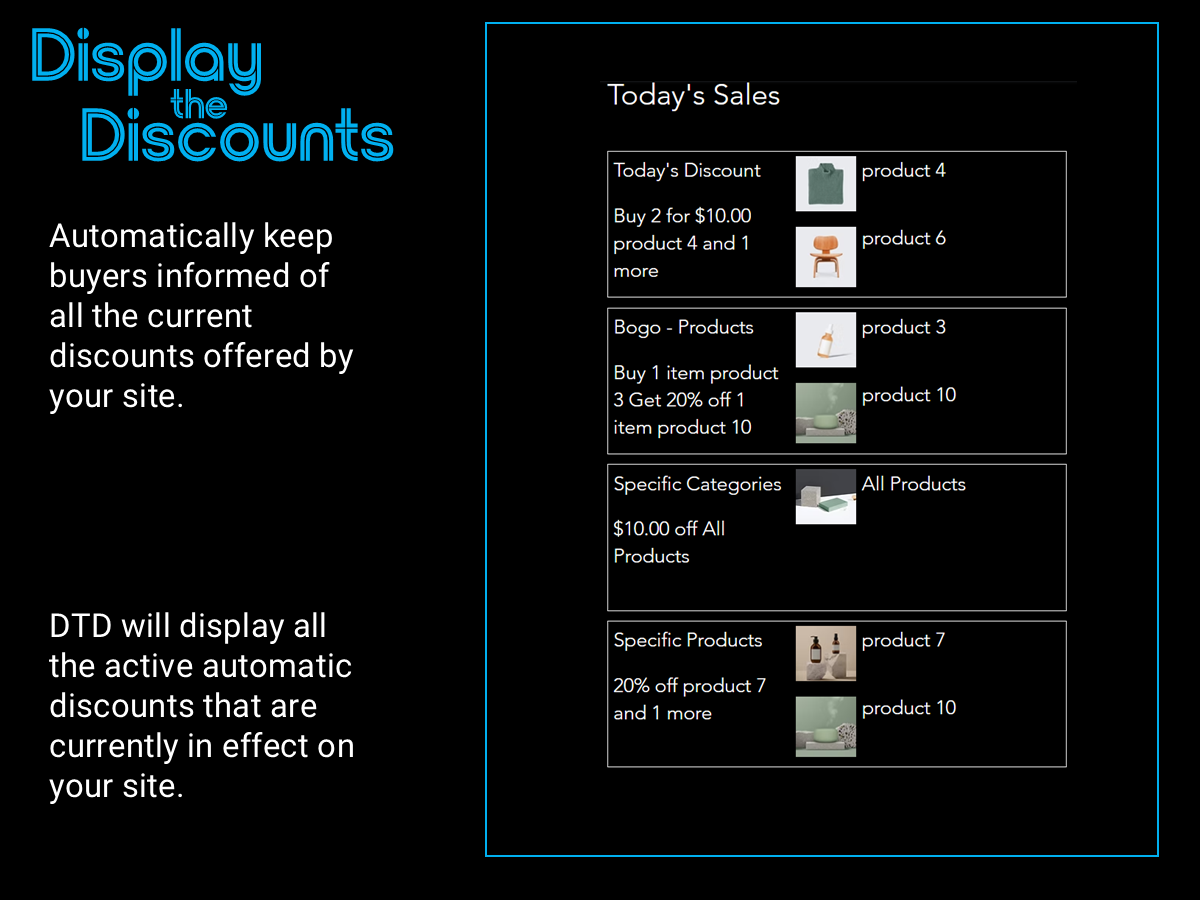 Automatically keep buyers informed of all the current active discounts offered by your site. With a single click the buyer opens the product. No more searching for discounts.