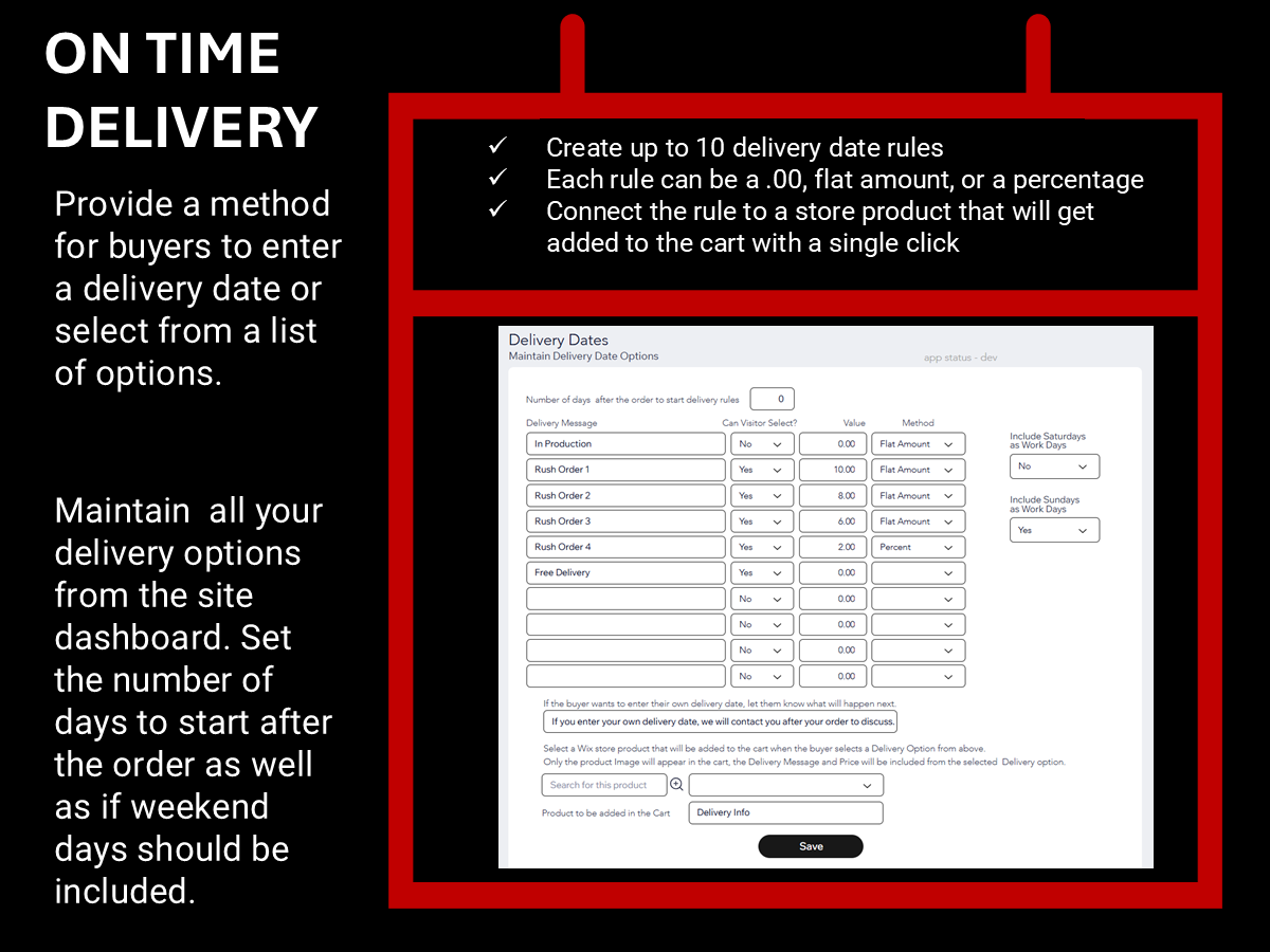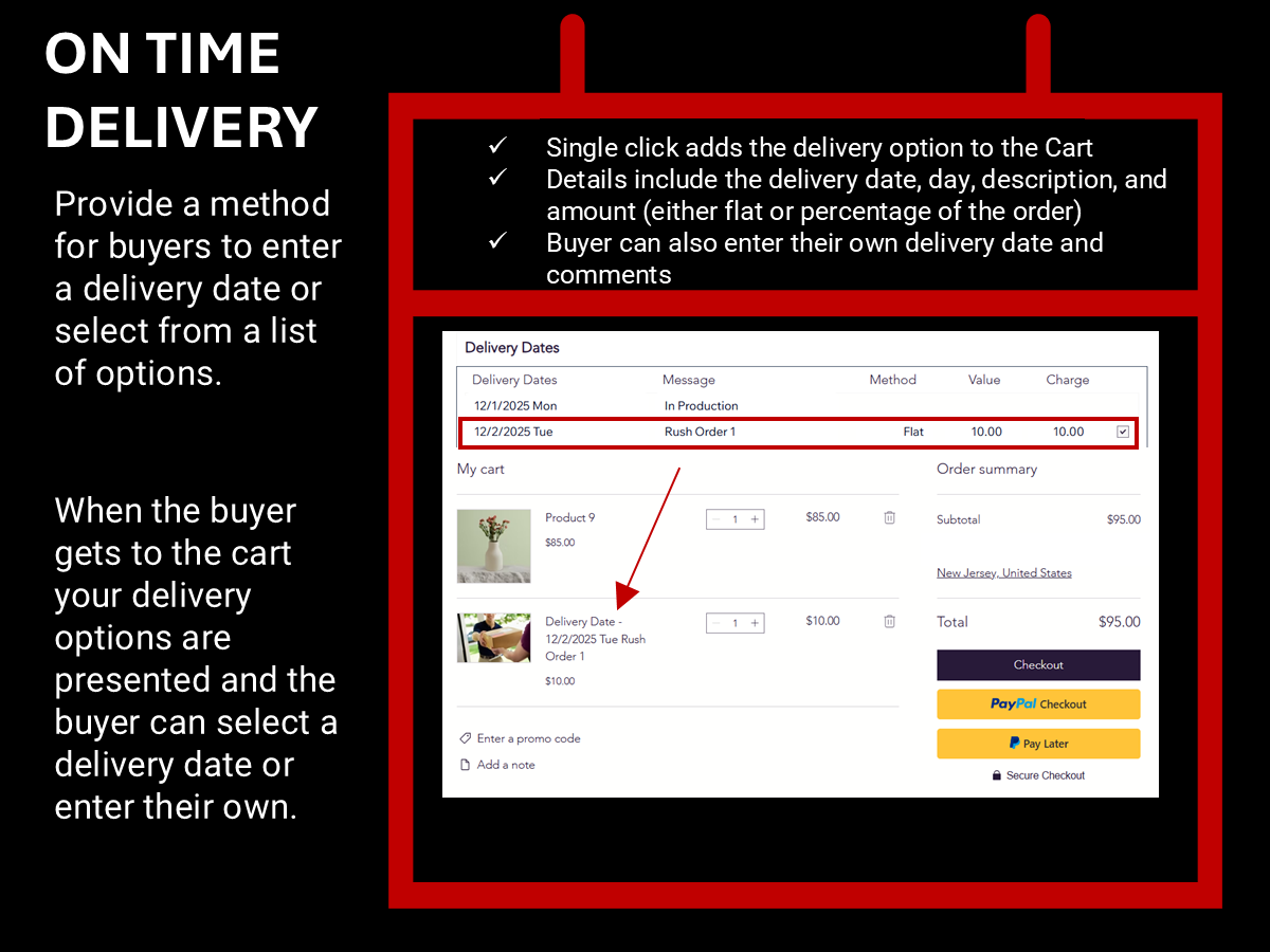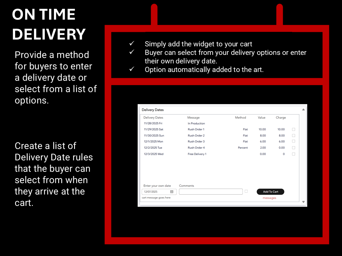 On Time Delivery provides a method of maintaining a list of 10 delivery date rules. Starting a number of days after the Order Date, the buyer simply reviews the delivery date options and can select one or enter their own delivery date. Each rule can be informational or describe a deliver option to charge either .00, a flat amount, or a percentage of the Order Total. A simple click adds the Delivery Option to the cart and a Delivery line item will display the delivery date, day, rule description, and amount. The information will appear in the cart and on the order.