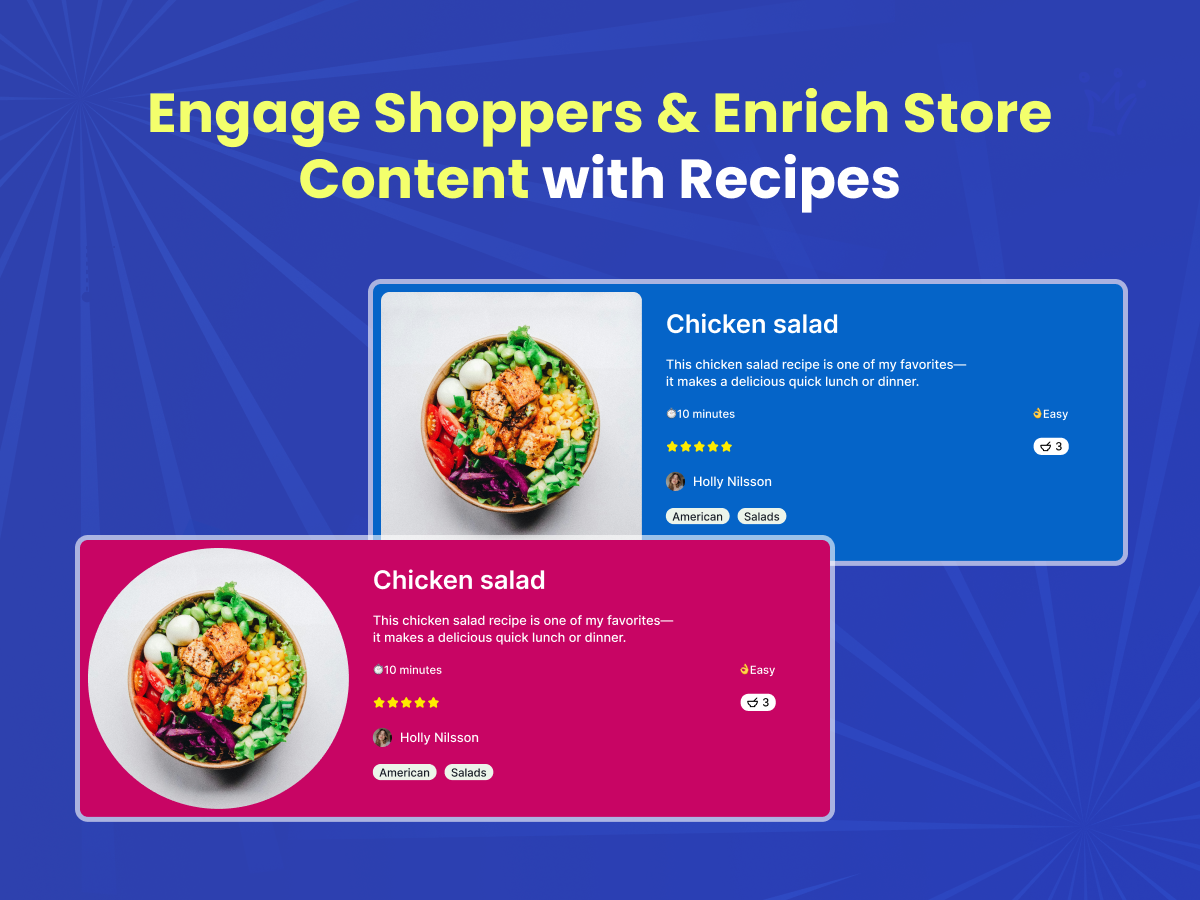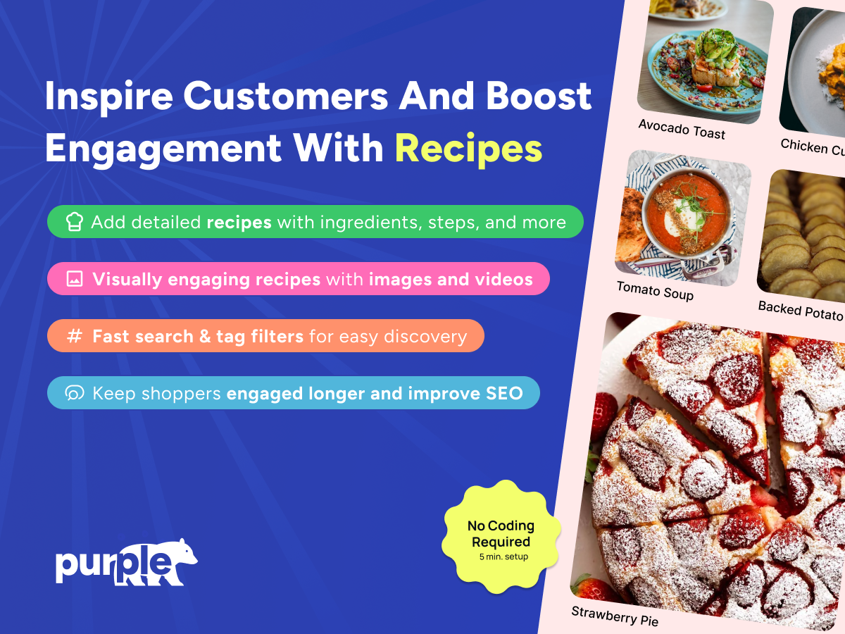 Recept tillåter handlare att publicera vackert strukturerat, högkvalitativt receptinnehåll som ökar engagemanget, förbättrar SEO och förhöjer den övergripande shoppingupplevelsen. Lägg enkelt till ingredienser, steg-för-steg instruktioner, foton, videor, tillagningsider, svårighetsnivåer, taggar och näringsdetaljer. Välj bland flexibla layouter, aktivera kraftfull sökfunktion och visa recept i en ren och modern popup. Med inbyggd AI så blir skapandet av en professionell receptsamling snabb, konsekvent och enkelt.
