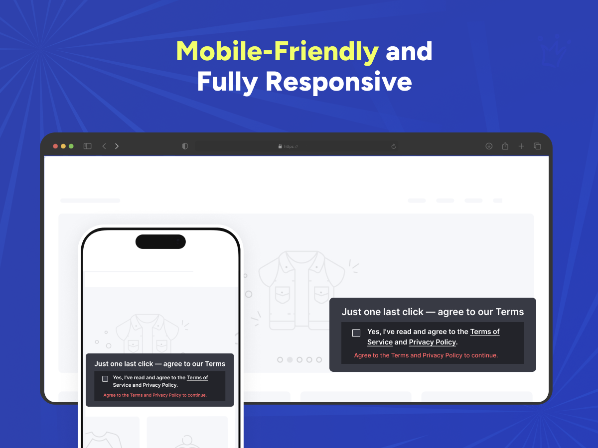 Håll din butik säker och öka kundförtroendet med Användarvillkorsrutan. Lägg till en anpassningsbar kryssruta som kräver att kunderna godkänner dina policys innan kassan, registreringar eller formulärsinskick. Anpassa etiketter, länkar, varningar och stilar för att matcha ditt varumärke - och logga automatiskt varje samtycke för efterlevnad.